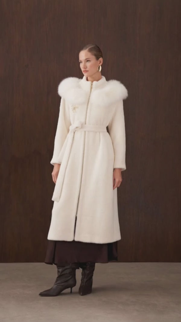 A softly brushed angora-touch coat with a graceful faux fur cape accent in elegant ivory. The fabric has a gentle short-hair texture that feels smooth, refined, and beautifully soft to the touch. A trend-forward shade for 2026 — designed as a timeless investment piece you’ll wear for years.