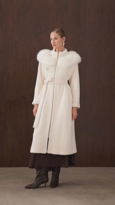 - Angora-touch midi coat with faux fur cape accent (non-removable)