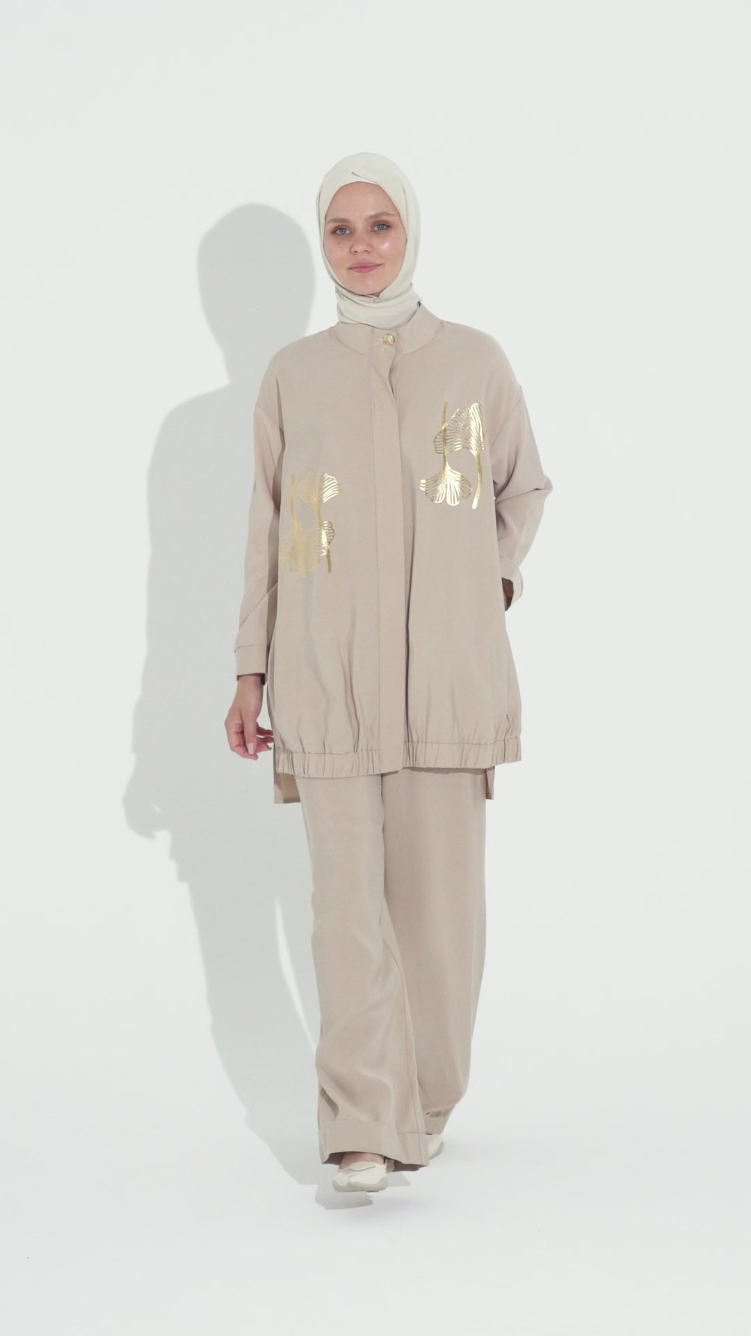 يتميز هذا التونيك الطويل بغطاء أزرار مخفي وزر معدني واحد للرقبة، متوفر باللونين الذهبي والفضي ليكمل نقشة السترة. كما يتضمن جيوبًا جانبية عملية لمزيد من الراحة والأناقة.